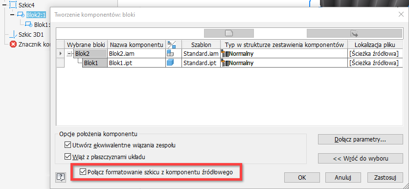 Nowa opcja „Połącz formatowanie szkicu z komponentu źródłowego” została dodana do okna dialogowego Wyprowadź. Umożliwia ona określenie, czy bloki szkicu w części pochodnej są aktualizowane, jeśli linie w części źródłowej zostaną zmienione.