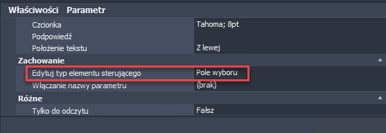 Gdy do formularza iLogic zostanie dodany parametr Prawda lub Fałsz, wówczas w opcji Typ sterowania jest teraz domyślnie ustawiane pole wyboru.