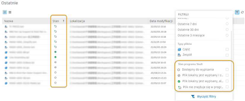 W przypadku korzystania z programu Vault można również filtrować za pomocą opcji Stan Vault.