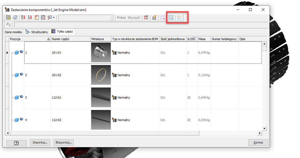 Okno dialogowe Zestawienie komponentów zostało przeprojektowane. Dwie opcje pokazywania lub ukrywania elementów z zerową ilością zostały dodane bezpośrednio do paska narzędzi. Użyj nowego przełącznika Ukryj/pokaż wiersze z zerową ilością na pasku narzędzi. Gdy ta opcja jest aktywna, można również kolejno ponumerować elementy za pomocą nowego przełącznika Automatyczne numerowanie sekwencyjnie.