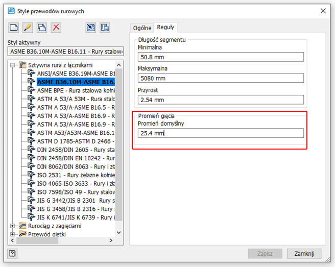 Teraz wszystkie domyślne wartości promienia gięcia są zapisywane w wyeksportowanym stylu przewodów rurowych. Promień gięcia w stylu przewodów rurowych można wyeksportować do pliku XML, a także zaimportować.