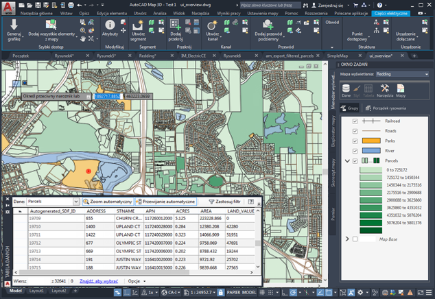 Ta mapa zawiera warstwy Menedżera wyświetlania opisujące tory kolejowe, drogi, parki, rzekę i działki. Każda warstwa ma przypisany inny styl. Przegląd elementów okna programu Zestaw narzędzi AutoCAD Map 3D zawiera Lekcja 2: Szybki przegląd programu Zestaw narzędzi AutoCAD Map 3D.