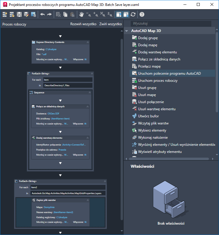 Panel Czynność znajdujący się po prawej stronie Projektanta procesów roboczych zawiera dwie kategorie czynności. Czynności wykonywane w Zestaw narzędzi AutoCAD Map 3D dotyczą Zestaw narzędzi AutoCAD Map 3D (w tym czynność uruchamiająca polecenia programu AutoCAD).