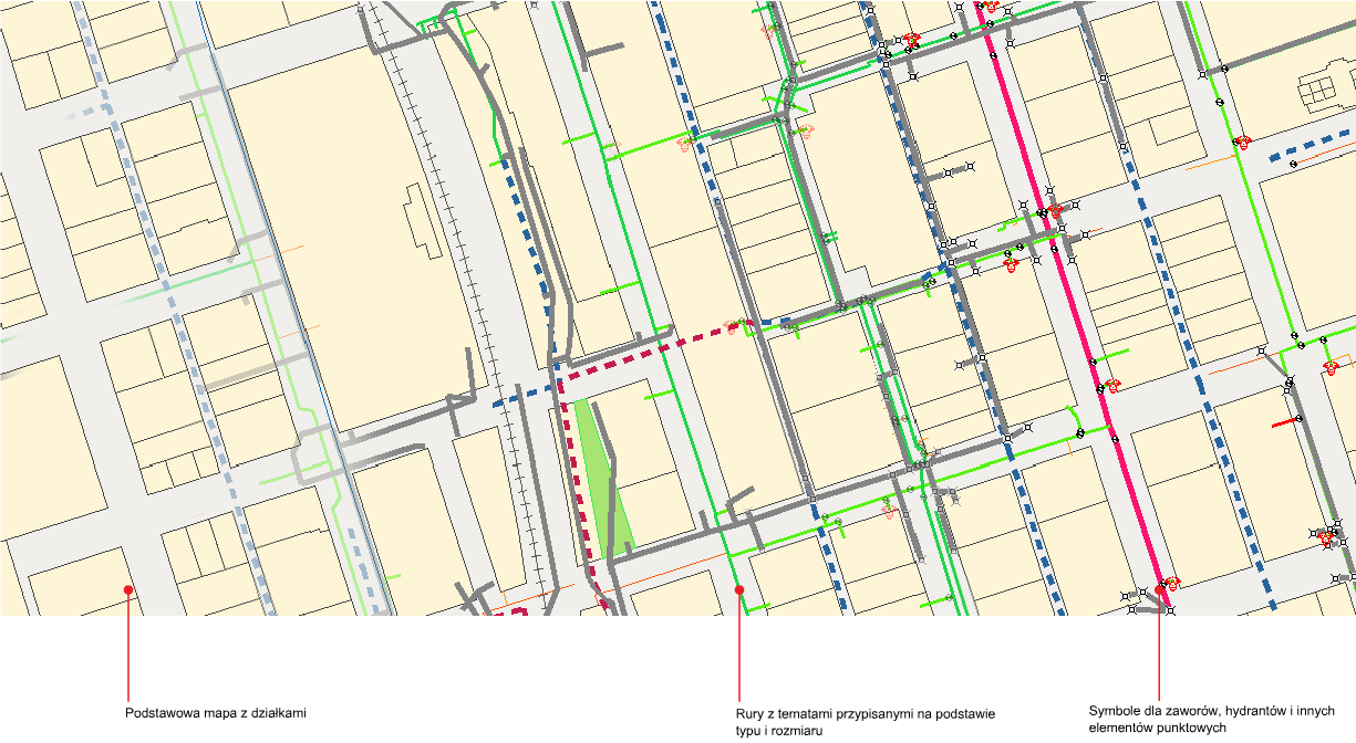 Ta mapa systemu wodociągowego składa się z elementów przechowywanych w zestawie plików SDF.