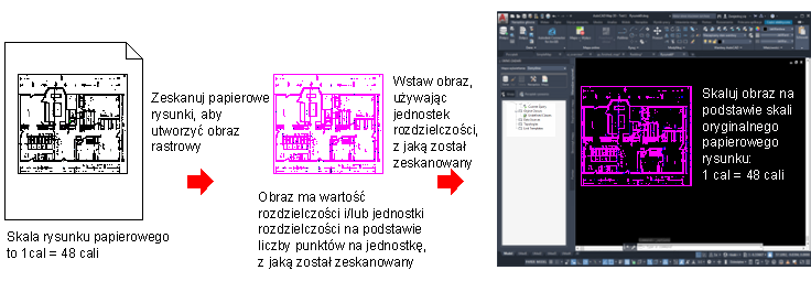 Obraz w poniższym przykładzie został narysowany w skali 1" = 48", zeskanowany przy rozdzielczości 300 dpi (punktów na cal), następnie wstawiony do rysunku z wartością rozdzielczości 300 i jednostkę rozdzielczości określoną jako Cale. Następnie został przeskalowany w rysunku w oparciu o jego skalę na papierze, tj. 1" = 48".