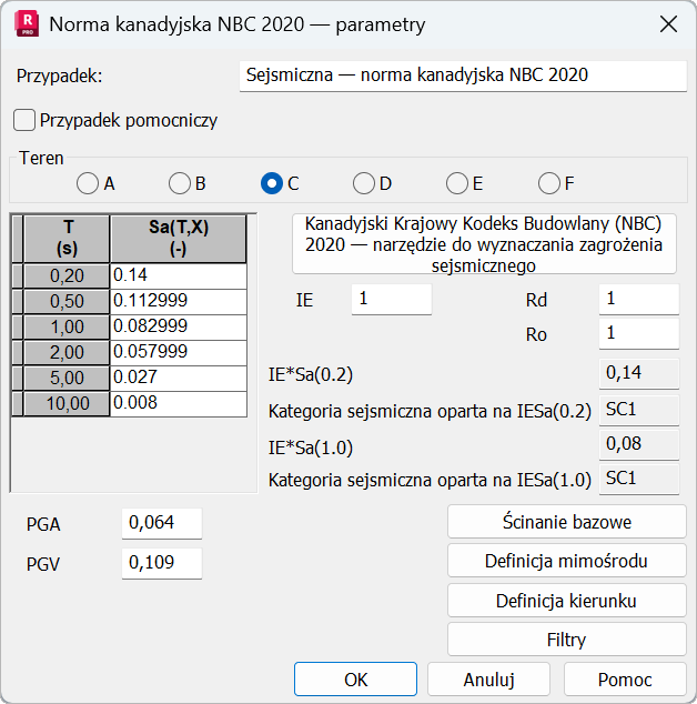 Wybierz kanadyjską normę sejsmiczną NBC 2020 w oknie dialogowym Definicja nowego przypadku lub kliknij pozycję Parametry w oknie dialogowym Typ analizy.