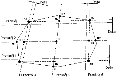 Aby przekroje 1, 3, 4 i 6 zostały poprawnie zdefiniowane wewnątrz paneli (brak sprecyzowanych współrzędnych), należy przesunąć te przekroje o wartość Delta w stosunku do głównych węzłów paneli N1, N2, N3 i N3. Wartość delta jest równa wartości tolerancji używanej do generowania modelu obliczeniowego.