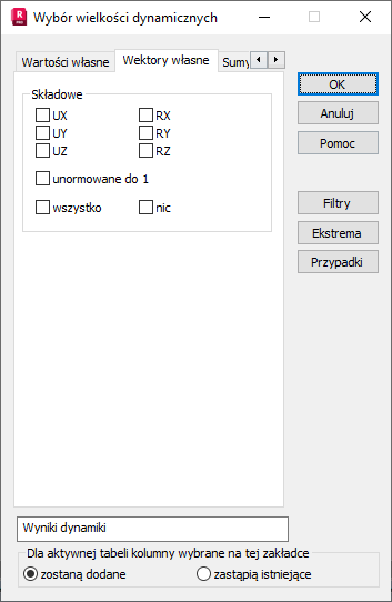 - UX , UY , UZ , RX , RY lub RZ. Jeżeli ta opcja zostanie wybrana, w tabeli pojawi się kolumna, w której prezentowane będą składowe UX, UY, UZ, RX, RY lub RZ wektorów własnych uzyskanych podczas obliczeń konstrukcji.