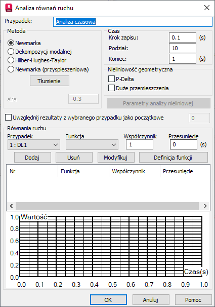 Uwaga: Metoda dekompozycji modalnej nie uwzględnia obciążeń w postaci wymuszonego przemieszczenia, prędkości lub przyspieszenia podpór. Jeżeli użytkownik chce uwzględnić te obciążenia w całkowaniu równań ruchu, należy wybrać metodę Hilber-Hughes-Taylor lub Newmarka (przyspieszeniową).