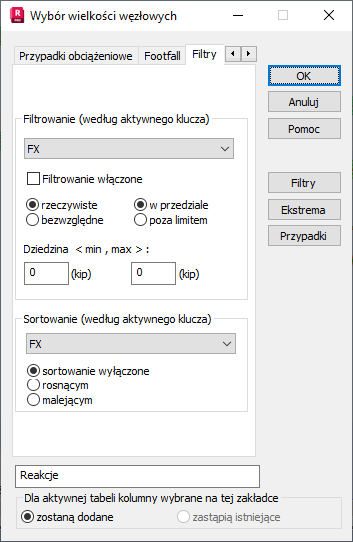 W górnej części okna znajduje się pole Filtrowanie (według aktywnego klucza). Pozwala ono na wybór wielkości, na podstawie której wykonane będzie sortowanie lub filtrowanie danych/wyników prezentowanych w tabeli. Przykładowo, jeżeli w tabeli przedstawiane są przemieszczenia węzłowe ramy przestrzennej, to użytkownik będzie mógł wybrać następujące wielkości: przemieszczenia UX, UY, UZ oraz obroty RX, RY, RZ. Parametrem domyślnym dla opcji sortowania jest zawsze pierwsza kolumna w oknie (czyli UX dla przemieszczeń).
