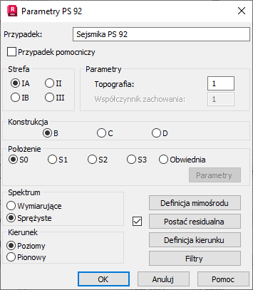 Parametry analizy sejsmicznej konstrukcji zależą od normy sejsmicznej, która będzie stosowana podczas obliczeń konstrukcji poddanej wpływom obciążeń sejsmicznych. Po wyborze francuskiej normy sejsmicznej AFPS ("Recommendations Association Francaise du Genie Paraseismiques 90") lub PS 92 ("Regles Parasismiques Francaise 1992") w oknie dialogowym Definicja nowego przypadku lub naciśnięciu przycisku Parametry w oknie Typ analizy na ekranie pojawia się okno dialogowe pokazane poniżej.