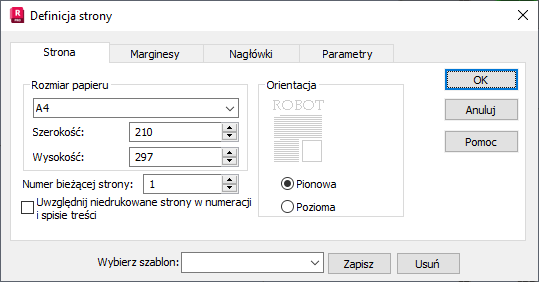 W powyższym oknie dialogowym użytkownik ma możliwość zdefiniowania następujących parametrów: rozmiar papieru, orientacji i numeru bieżącej strony.