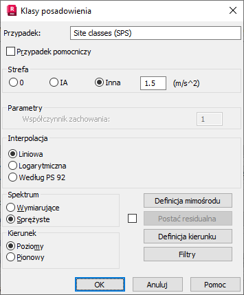 Parametry analizy sejsmicznej konstrukcji zależą od normy sejsmicznej, która będzie stosowana podczas obliczeń konstrukcji poddanej wpływom obciążeń sejsmicznych. Po wyborze francuskich wymagań (Législation sur les installations classées (JO du 17 juillet 1993)) w oknie dialogowym Definicja nowego przypadku lub naciśnięciu przycisku Parametry w oknie Typ analizy na ekranie pojawia się okno dialogowe pokazane poniżej.