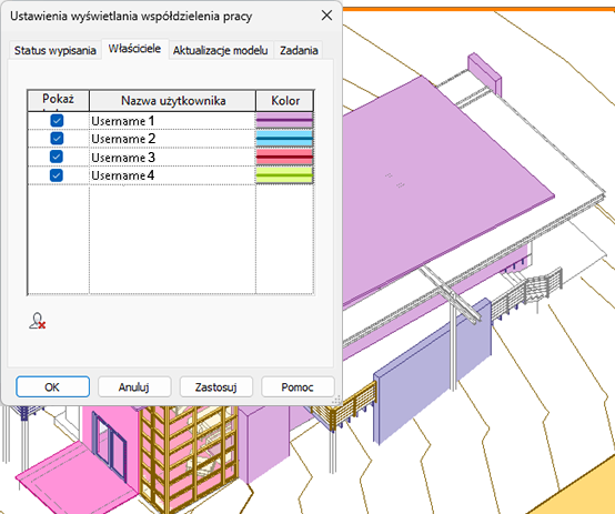 Ustawienia wyświetlania współdzielenia pracy. Określony kolor dla odpowiedniego właściciela zostanie wyświetlony w modelu.