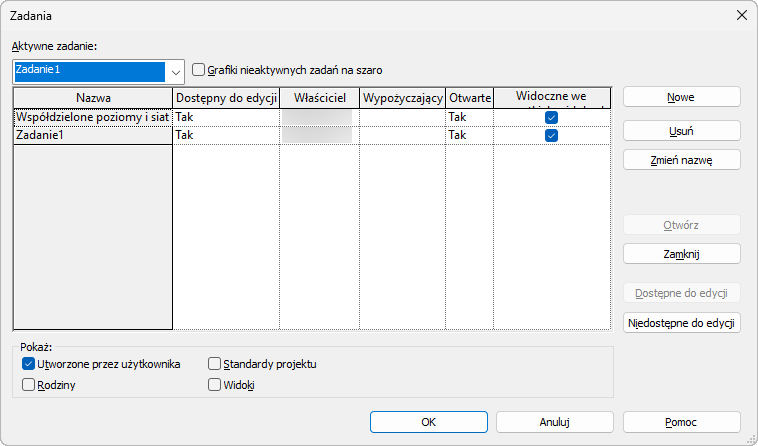 Na obrazie przedstawiono okno dialogowe Zadania z dwoma domyślnymi zadaniami utworzonymi przez użytkownika: Współdzielone poziomy i siatki oraz Zadanie1.