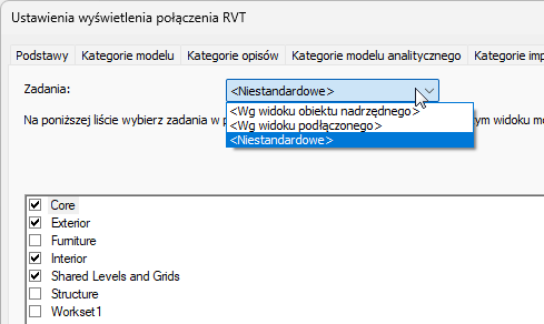 Dla modelu nadrzędnego użyj karty Zadania w oknie dialogowym Ustawienia wyświetlenia połączenia RVT. Na tej karcie można wybrać określone zadania, które mają zostać wyświetlone w widoku modelu nadrzędnego.