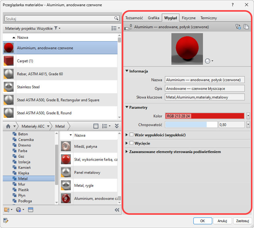 W Przeglądarce materiałów te informacje są wyświetlane na kartach Identyfikacja, Grafika i Wygląd w panelu Edytor materiałów.