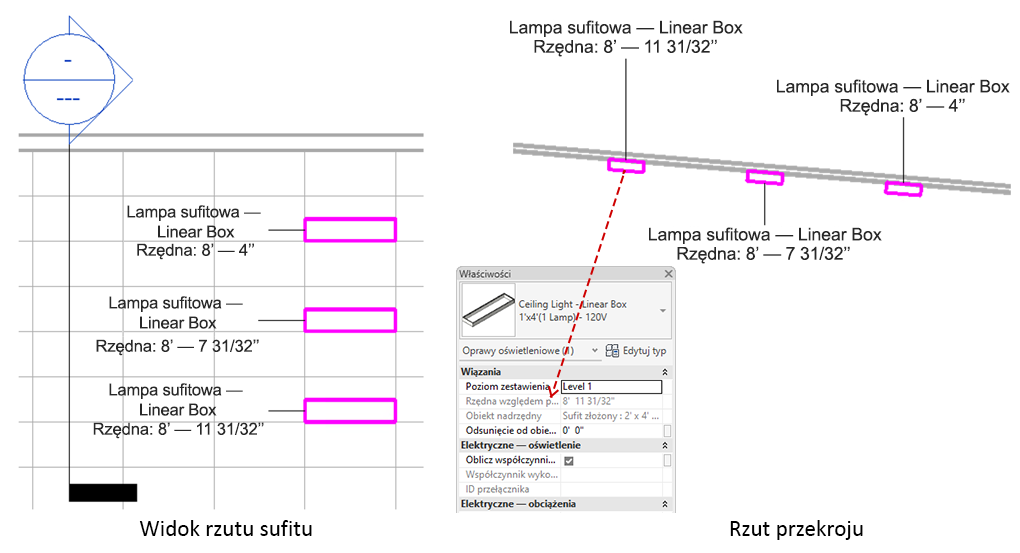 Parametru Rzędna od poziomu nie można edytować, gdy element jest umieszczony na powierzchni niepionowej, na przykład w przypadku umieszczenia gniazda w podłodze lub oprawy oświetleniowej na suficie.