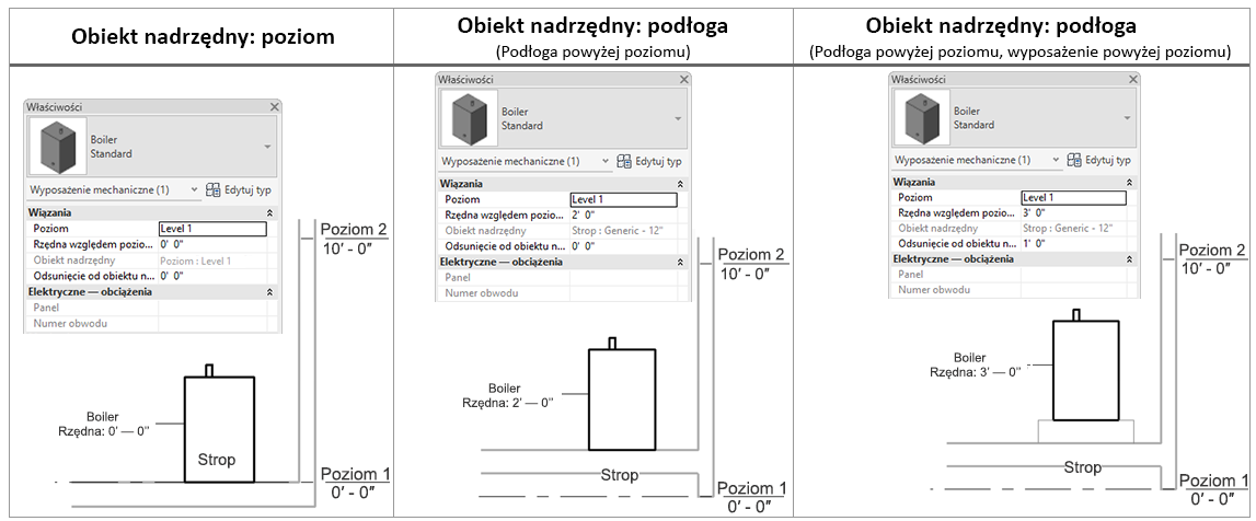W poniższym przykładzie podłoga znajduje się na wysokości 2' 0" powyżej poziomu. Gdy bojler zostanie umieszczony na podłodze, wartość parametru Rzędna od poziomu wynosi 2' 0", a wartość parametru Odsunięcie od obiektu nadrzędnego wynosi 0' 0".