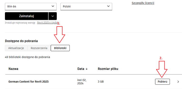 Wybierz zawartość, jaka zostanie pobrana i zainstalowana dla programu Revit.