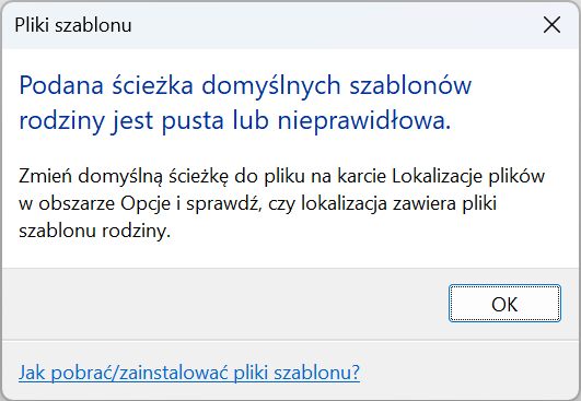 Uwaga: Usunięcie pakietów zawartości istotnej może spowodować, że program Revit będzie wyświetlał następujący komunikat z powodu braku szablonów rodzin w ich ścieżce określonej w pliku Revit.ini.