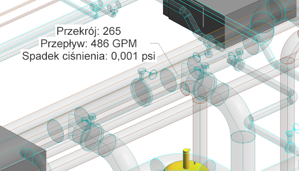 Utwórz oznaczenia analitycznych segmentów rur, aby wyświetlać szczegóły obliczeń sieci dla pojedynczego segmentu. Tego rozwiązania można używać jako alternatywy dla Kontrolera systemu, szczególnie w przypadku produkcyjnych sieci instalacji rurowych.
