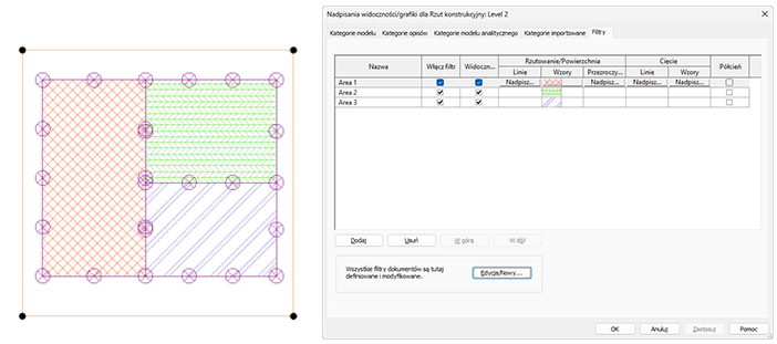 Użyj filtrów, aby zidentyfikować każdą obwiednię obciążenia powierzchniowego w widoku rzutu na podstawie parametrów obciążeń.