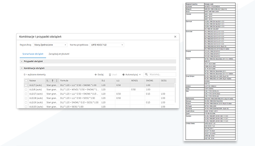 Można używać generatora automatyzacji kombinacji obciążeń w oparciu o wybrany region/kraj i normę projektową.