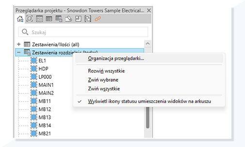 Obecnie można organizować zestawienia rozdzielnic w Przeglądarce projektu poprzez sortowanie, filtrowanie lub grupowanie.