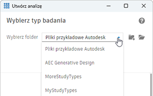 Aby utworzyć badanie przy użyciu jednego z przykładów Autodesk, w oknie dialogowym Utwórz badanie w polu Wybierz folder wybierz opcję Pliki przykładowe Autodesk.