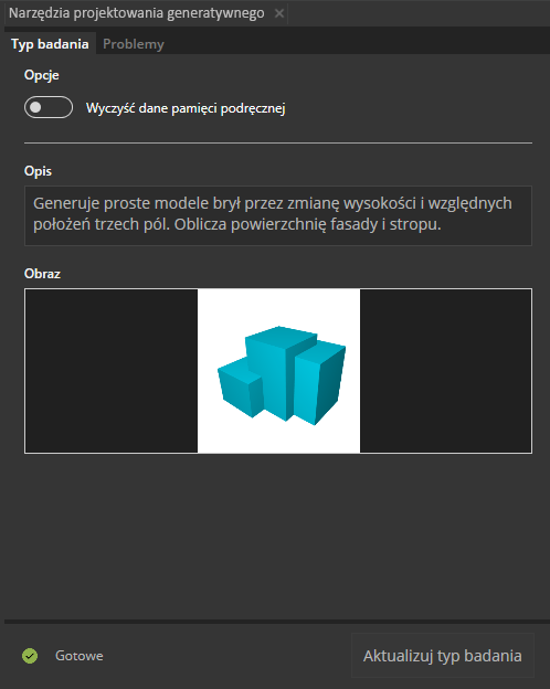 Uwaga: Po uaktualnieniu może nastąpić jednorazowa aktualizacja istniejących danych wynikowych badań. Jeśli utworzono wiele badań, może wystąpić niewielkie opóźnienie podczas pierwszego uruchamiania dodatku projektowanie generatywne po uaktualnieniu.