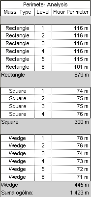 Uwaga: Wartości obwodu obejmują cały obwód każdego zakresu kondygnacji, nawet jeśli zakresy kondygnacji w sąsiednich połączonych bryłach się nakładają.