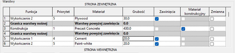 Warstwa jest przypisana do jednego wiersza. Jej grubość jest stała, równa wysokości ściany. Możesz zmienić jej grubość w rzędzie przypisanym do niej. Do każdej warstwy można także przypisać materiał.