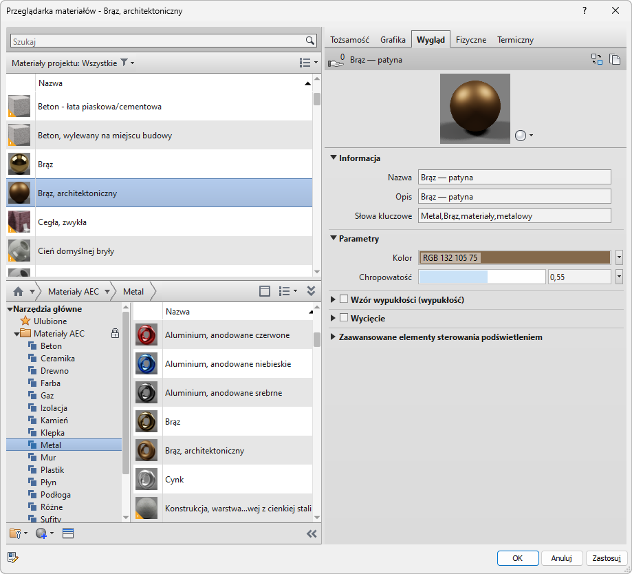 Poniższy rysunek przedstawia niektóre właściwości wyglądu wybranego materiału, tak jak są one wyświetlane w przeglądarce materiałów.