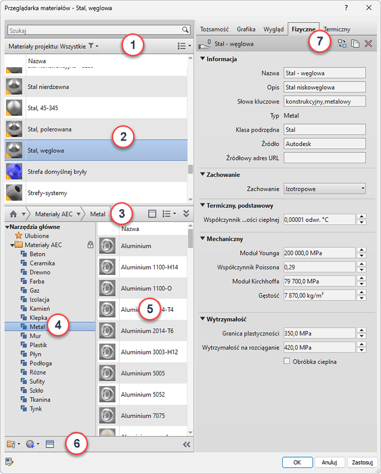 | 7 | Jeśli na liście bibliotek (lewy panel) został wybrany materiał, w prawym panelu wyświetlane są karty (zasoby) skojarzone z materiałem. Kliknij karty (na przykład Identyfikacja lub Wygląd), aby wyświetlić właściwości i zasoby materiału. Podczas przeglądania materiałów w bibliotekach właściwości mają status tylko do odczytu. |