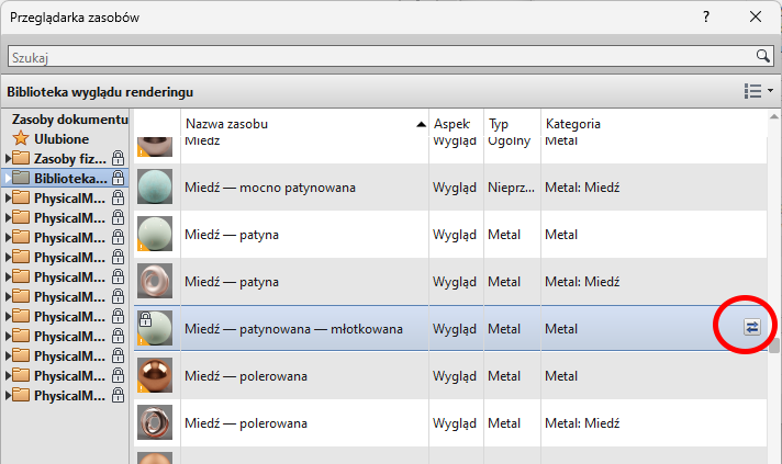 Istniejący zasób można zastąpić innym, wybranym z Przeglądarki zasobów. Materiał przyjmie właściwości nowego zasobu.