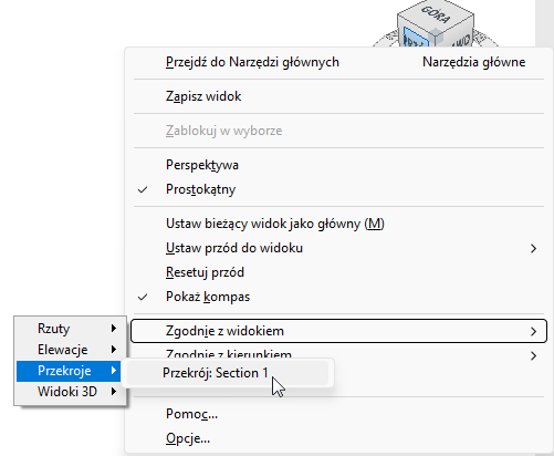 Używając narzędzia ViewCube, można zorientować widok 3D w dowolnym rzucie, widoku elewacji, przekroju lub widoku 3D w modelu.