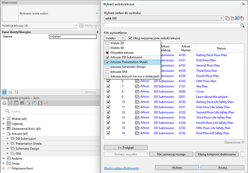 Każdy arkusz zawiera parametr Kolekcja arkuszy, z poziomu którego dostępne są wszystkie kolekcje w modelu.