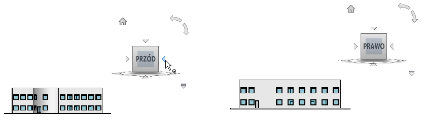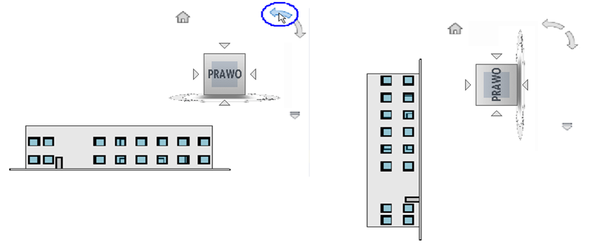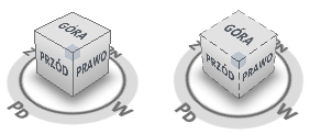 Gdy model jest wyświetlany w jednym z widoków powierzchni, w pobliżu narzędzia ViewCube są wyświetlane dwa przyciski strzałek obrotu. Strzałki obrotu służą do obracania bieżącego widoku o 90 stopni w kierunku zgodnym z ruchem wskazówek zegara lub w kierunku przeciwnym wokół środka widoku.