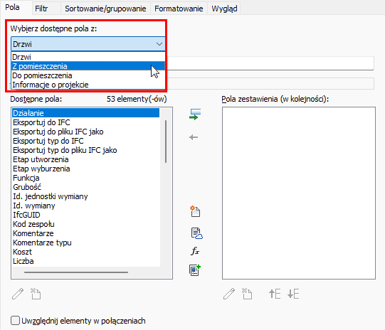 - Na karcie Pola dla opcji Wybierz dostępne pola z listy rozwijanej kliknij pozycję Z pomieszczenia lub Do pomieszczenia.