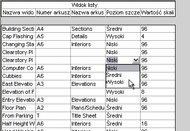 Na liście widoków można wyświetlać i modyfikować parametry wielu widoków jednocześnie. Załóżmy na przykład, że do listy widoków zostały włączone parametry Poziom szczegółowości i Skala. Na liście widoków można ustawić niski, średni lub wysoki poziom szczegółowości wybranych widoków lub zmienić skale widoków, tak aby ich ustawienia były spójne. Ponadto można zmienić nazwę widoku lub tytuł widoku, które są wyświetlane na arkuszach. Korzystając z listy w ten sposób, można z jednego położenia zidentyfikować i poprawić niespójne ustawienia widoków.