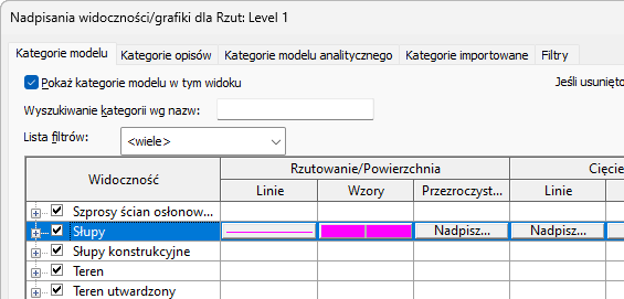 Na poniższej ilustracji kategoria Słupy ma nadpisania dla linii i wzorów rzutowania/powierzchni.