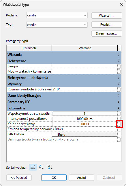 - W oknie dialogowym Parametry i kategoria rodziny w obszarze Parametry rodziny wybierz opcję Źródło światła.