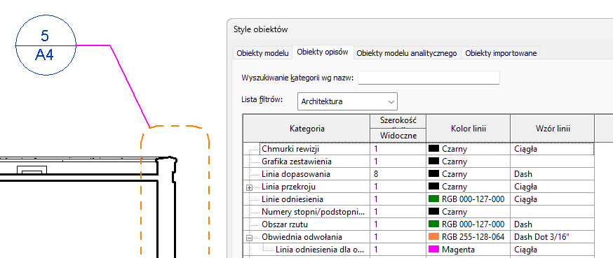 Można sterować szerokością, kolorem oraz wzorem linii używanych w znacznikach odwołania i liniach odniesienia. Ustawienia określone w tym miejscu mają zastosowanie do wszystkich odwołań w projekcie.