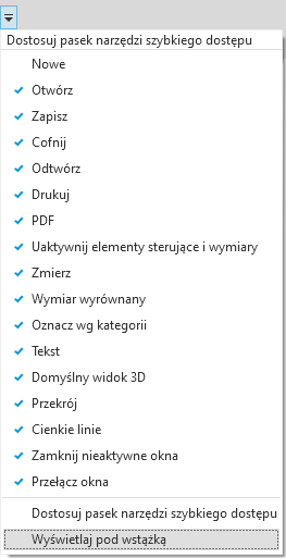 Jeśli z paska narzędzi szybkiego dostępu usunięto domyślne narzędzia, można je z powrotem dodać. W tym celu należy kliknąć menu rozwijane Dostosuj pasek narzędzi szybkiego dostępu i zaznaczyć wybrane narzędzie.