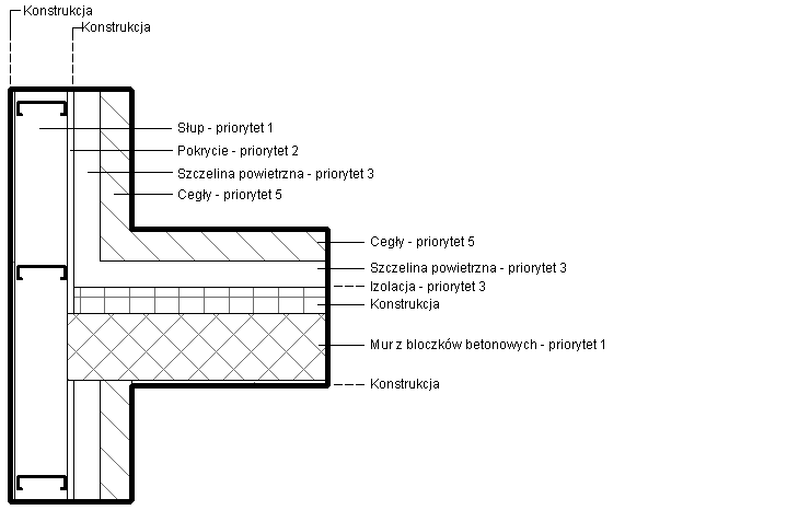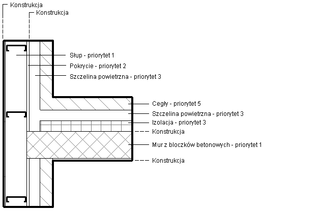 Następująca ilustracja demonstruje łączenie się warstw o wyższym stopniu ważności w kolejności przed warstwami o niższym stopniu ważności. Warstwa ściany poziomej o stopniu ważności 1 CMU przechodzi przez wszystkie warstwy aż do momentu, kiedy zetknie się z warstwą ściany pionowej o stopniu ważności 1 stud. Zauważ, że izolacja ściany poziomej nie przechodzi przez przestrzeń w ścianie pionowej, ponieważ obie ściany mają warstwy o stopniu ważności 3 i są poza warstwą nośną.