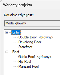 Można, na przykład, utworzyć jeden zestaw wariantów projektu, aby przedstawić różne projekty wejścia do budynku. Dla różnych konfiguracji dachu można utworzyć kolejny zestaw wariantów projektu. Każdy zestaw wariantów projektu zawiera jeden wariant główny i co najmniej jeden wariant drugorzędny.