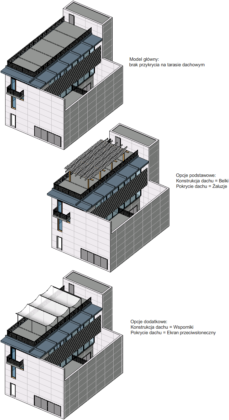 Wariantów projektu można używać, aby przeglądać i poznawać wiele wariantów projektów w miarę rozwoju projektu. W dowolnym momencie procesu tworzenia projektu można korzystać z wielu zestawów wariantów projektu. Zazwyczaj każdy zestaw wariantów projektu odnosi się do konkretnego zagadnienia lub obszaru. Na przykład aby przeglądać dostępne rozwiązania dotyczące pergoli i zasłony przeciwsłonecznej dla tarasu na dachu, można utworzyć zestaw wariantów o nazwie Pokrycie dachu zawierający wiele projektów pokrycia dachu (Zasłona przeciwsłoneczna lub Żaluzje). Dodatkowo można utworzyć zestaw wariantów o nazwie Konstrukcja dachu zawierający wiele projektów konstrukcyjnych (Wsporniki lub Belki). Po wybraniu ostatecznego projektu, można włączyć wybrane warianty do modelu głównego i usunąć inne rozwiązania.