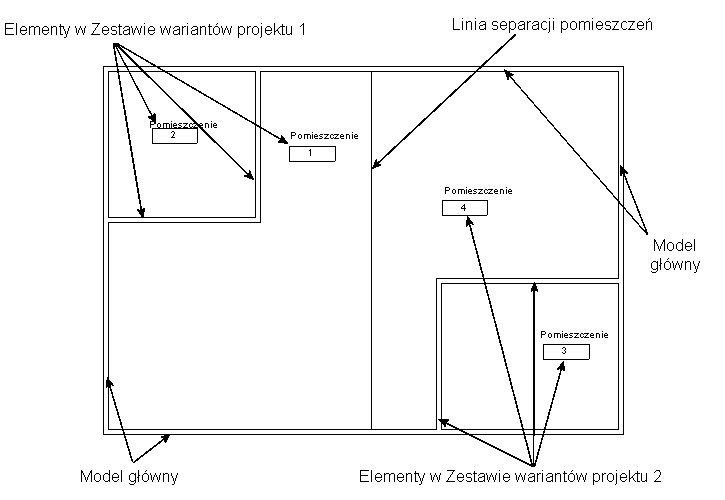 Jeśli kształt, wielkość i położenie pomieszczenia są takie same w różnych wariantach, a właściwości przypisane do pomieszczenia mają być takie same dla wszystkich wariantów, zachowaj pomieszczenie w modelu głównym.