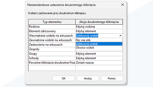 Dostosowano okno dialogowe Niestandardowe ustawienia dwukrotnego kliknięcia w obszarze Opcje.